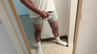 super-naughty dude in milky socks stroking off his manhood, noisy bellowing